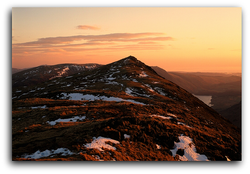 The soft light of sunset from the summit of Yewbarrow in the western fells of the Lake District.