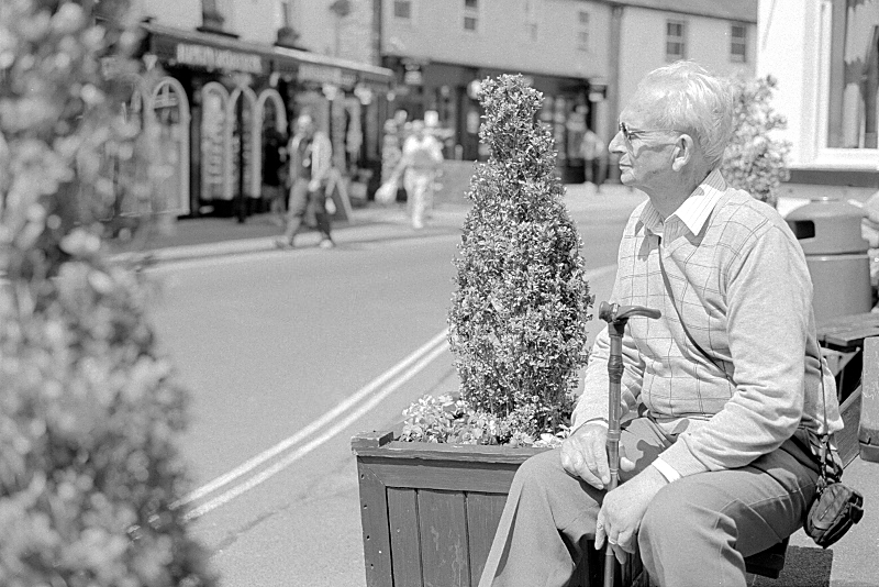 An old man stops to rest for a moment outside The White Lion pub.