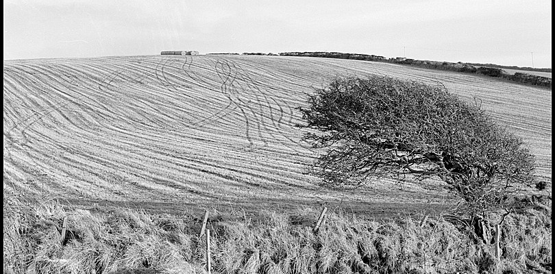 Windswept tree and fallow fields near St Bees on the west coast of Cumbria. This area is very exposed to severe storms blowing in off the Irish sea – a wild and windswept piece of land. Cumbria, Dec 2012
